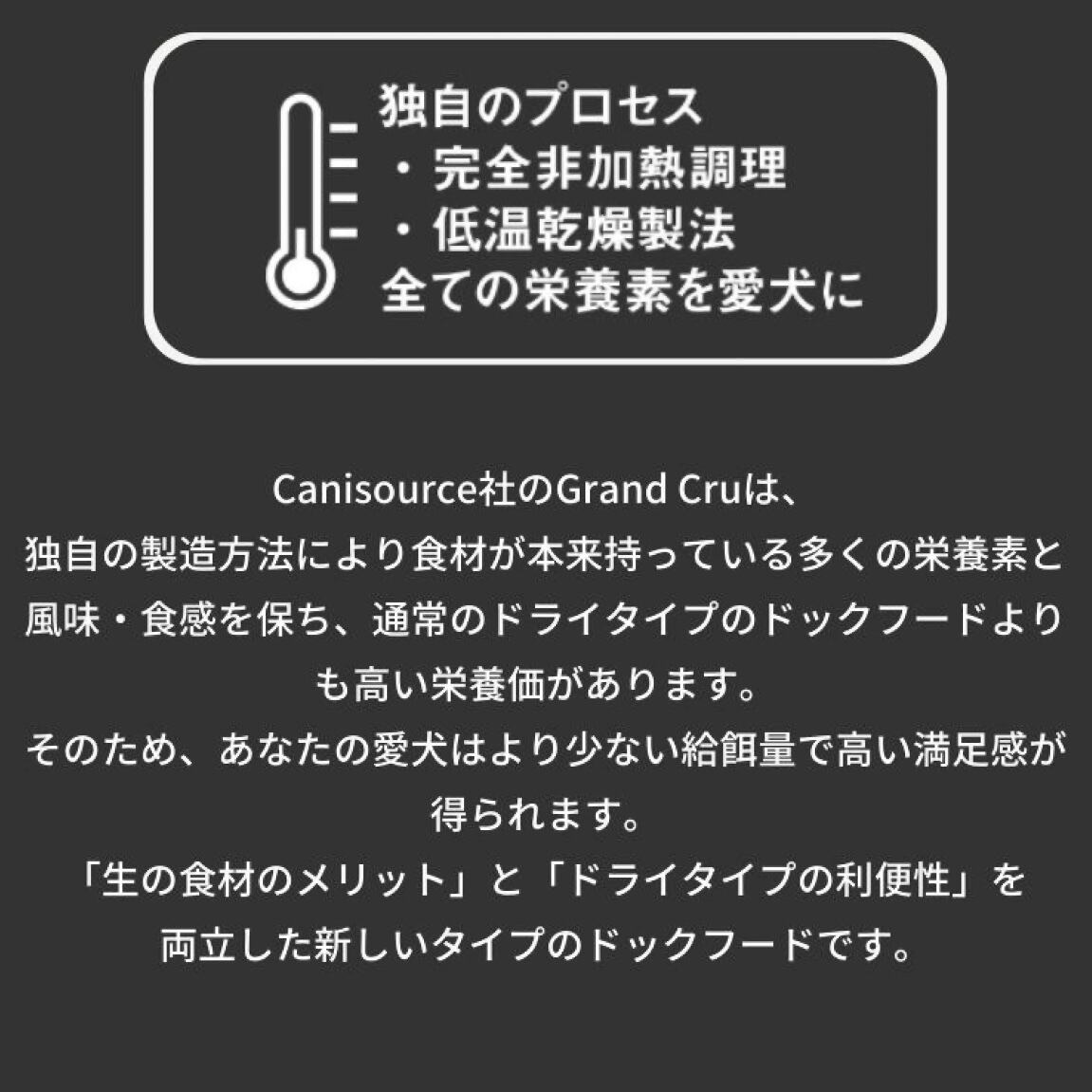 Canisource『Grand Cru』は独自の低温乾燥製法により食材が本来持っている多くの栄養素と風味・食感を保ち、通常のドライタイプのドックフードよりも高い栄養価があります。